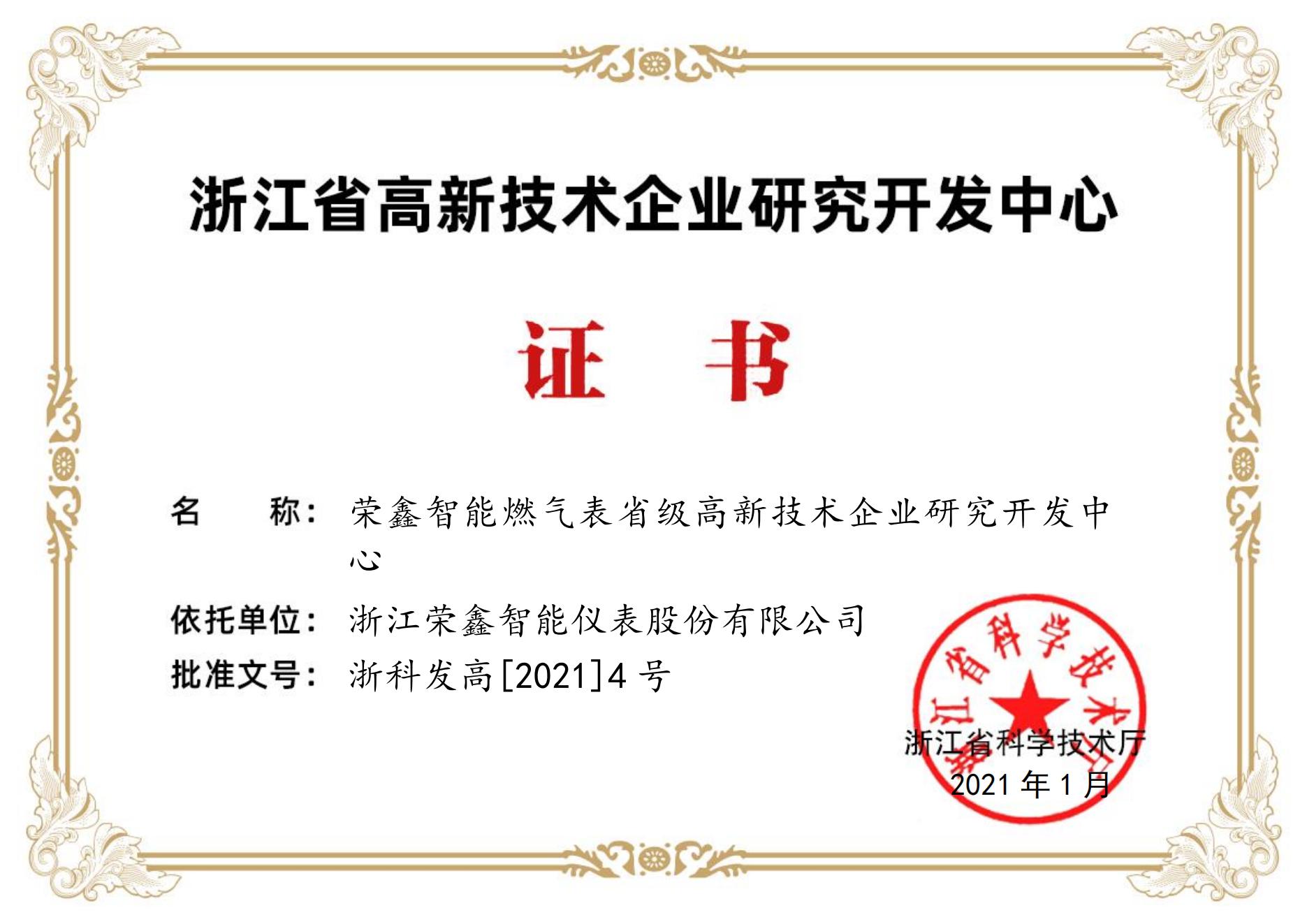 浙江省高新技术企业研发中心证书2024-05-31 -